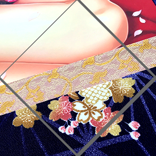 「麻の葉地に桜散し」という黒京友禅染は、桜の下で頬を染めるそに子のイラストの世界観そのものを艶やかに演出しております。